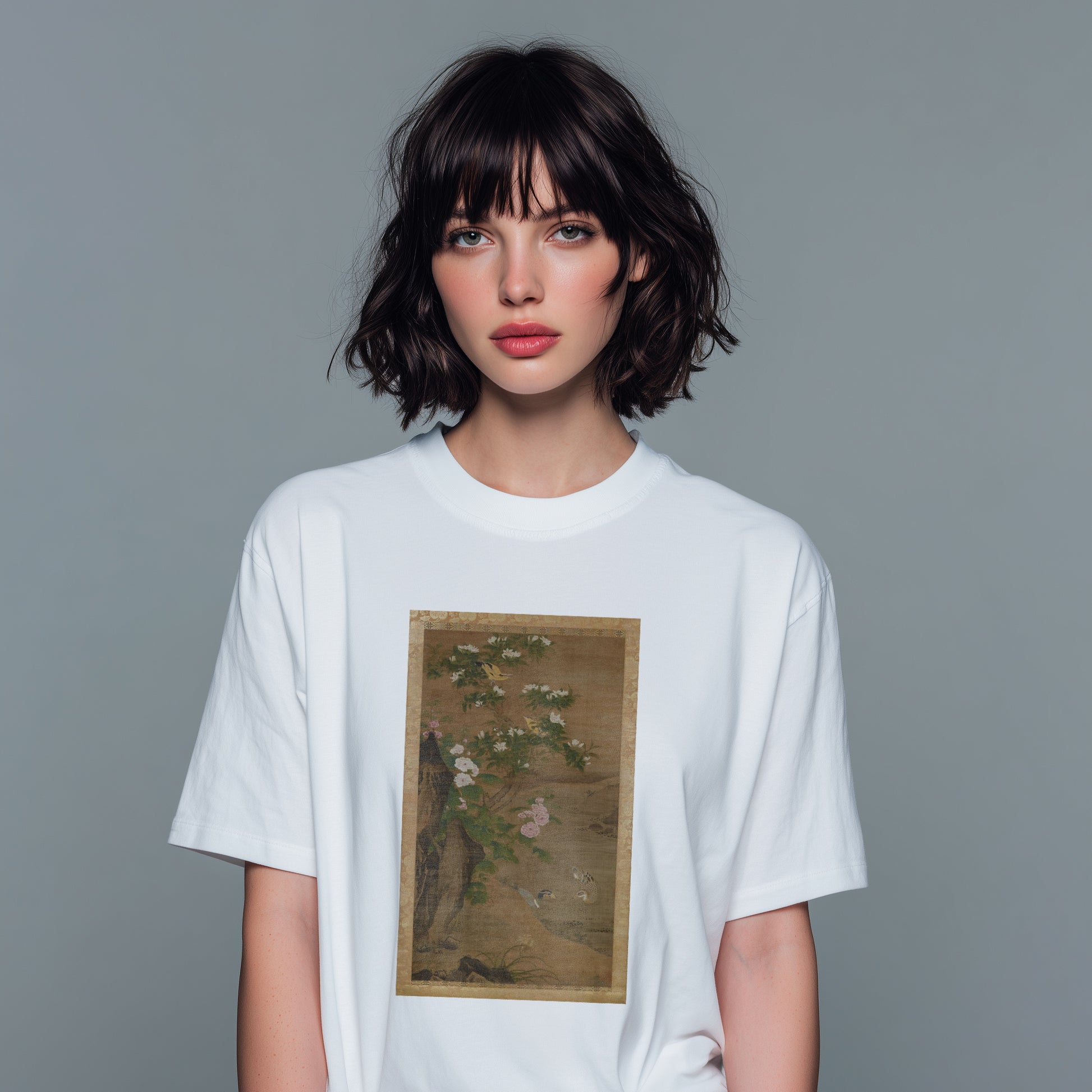 This work represents "Summer" from a four-panel series themed on the four seasons. Set in a garden with distinctive rocks, it features blooming gardenias, daylilies, and hollyhocks, along with vivid depictions of wild birds such as ducks, black-naped orioles and titmice. Considered Lü Ji’s greatest masterpiece, it also influenced Japanese art from the Muromachi period onward.